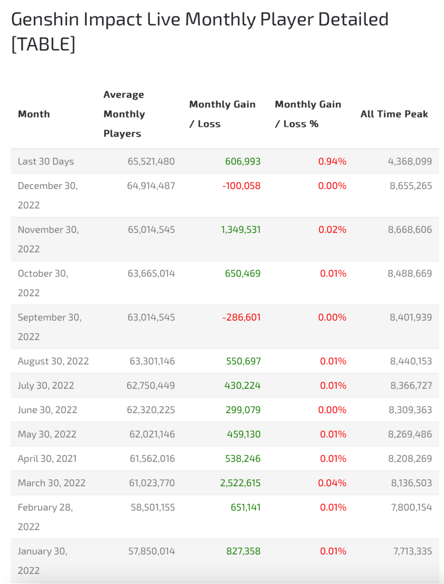 といっても、流出率はMAUのわずか0.45%でしかなく、それだけで原神の人気がピークアウトをしたとは言えないものの、2020年9月に全世界同時リリースされてちょうど2周年にあたる2022年9月に初めてのMAU減少を示すというのは象徴的なできごとでもある。