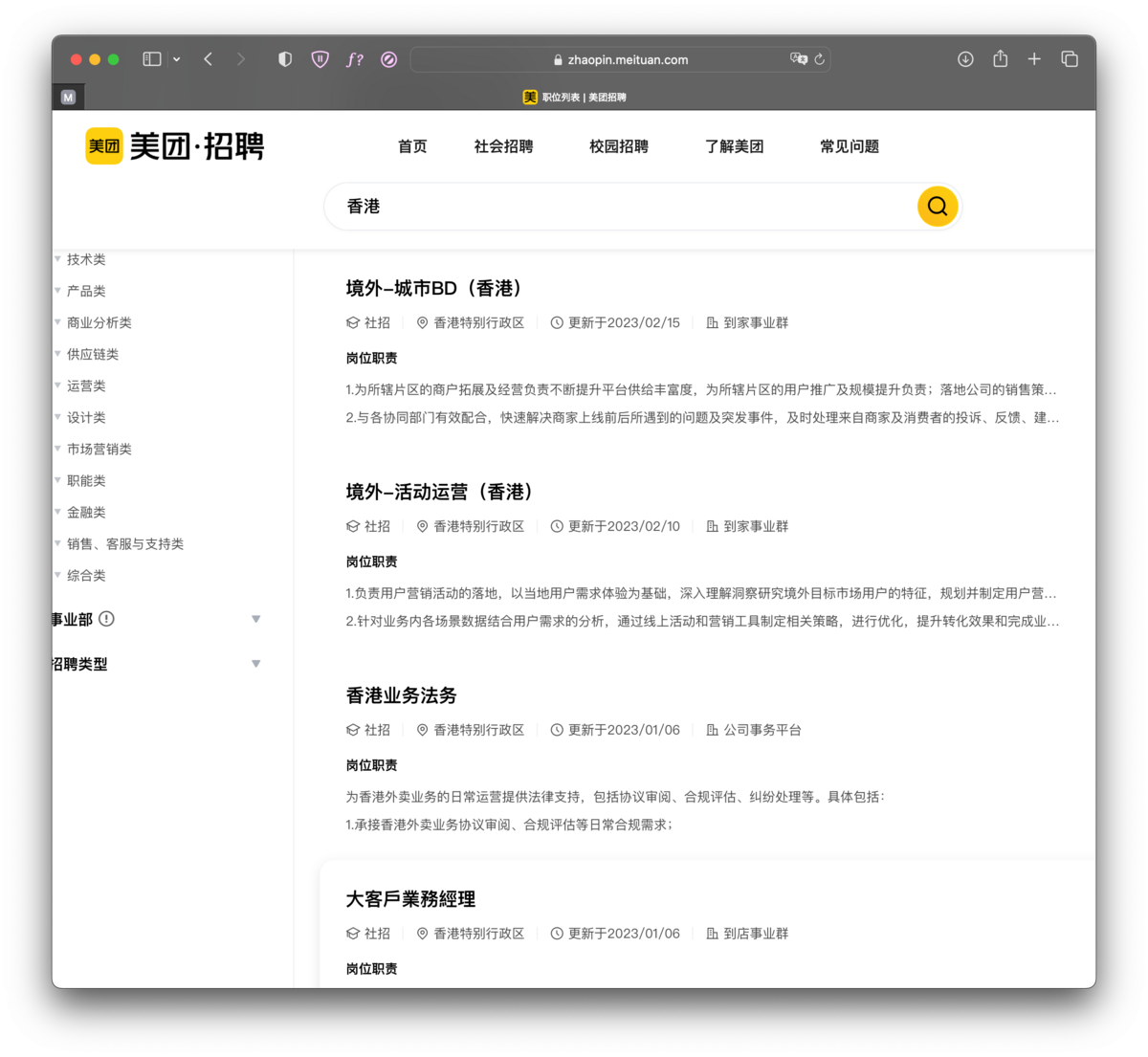 美団が香港に進出をするという話はこれまでにも何回か語られながら、実際の進出は見送られてきた。しかし、今回は違うようだ。美団の公式サイトの人材募集のコーナーで、デリバリー業務を行う到家事業群が、勤務地香港の人材募集を行っている。