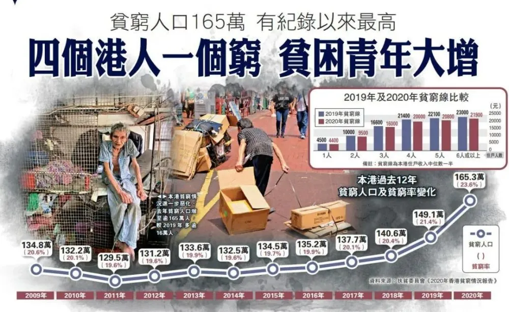 香港政府が2021年末に発表した「2020年香港貧困状況報告」によると、香港の相対的貧困率が23.6%、貧困人口は165.3万人と過去最悪になった。2020年の新型コロナの感染拡大による影響が大きいと見られている。