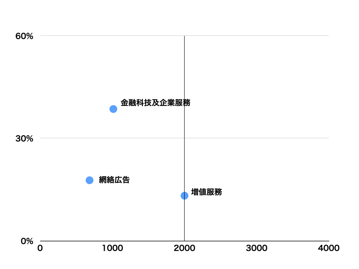 増値服務が半分入っている右下の象限は、成長率は低いが収入が大きい事業で、安定をした収入源になっている。