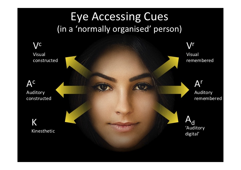 このNLPでは、眼球の動きにも意味があるとされる。脳が視覚イメージを生成しているときは眼球は上を向く。さらに左を向くときは過去の視覚イメージを思い出している時で、右を向くときは未知の視覚イメージを構築している(未来)時だという。つまり、嘘をつく時は、あり得ないイメージを構築するのだから、右上を見るということになる。