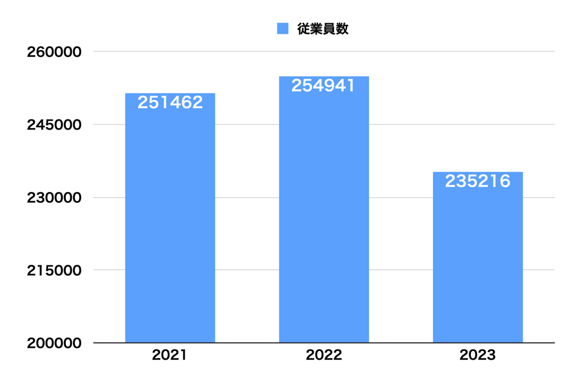 ▲アリババの従業員数。2023年3月時点で、1年前より2万人近く減っている。