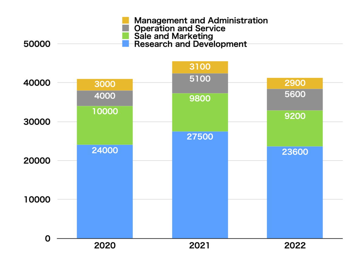 2021年には4.55万人だったものが、2022年には4.13万人となり4000人規模、従業員全体の9.2%のリストラとなりました。部門別に見ると、Operation and Serviceのみ5100人から5600人に増員されています。ロボタクシーが正式営業を始め、拡大をする関係から、この部門には増員が必要だったことが伺われます。その他の部門は全面的に縮小しています。