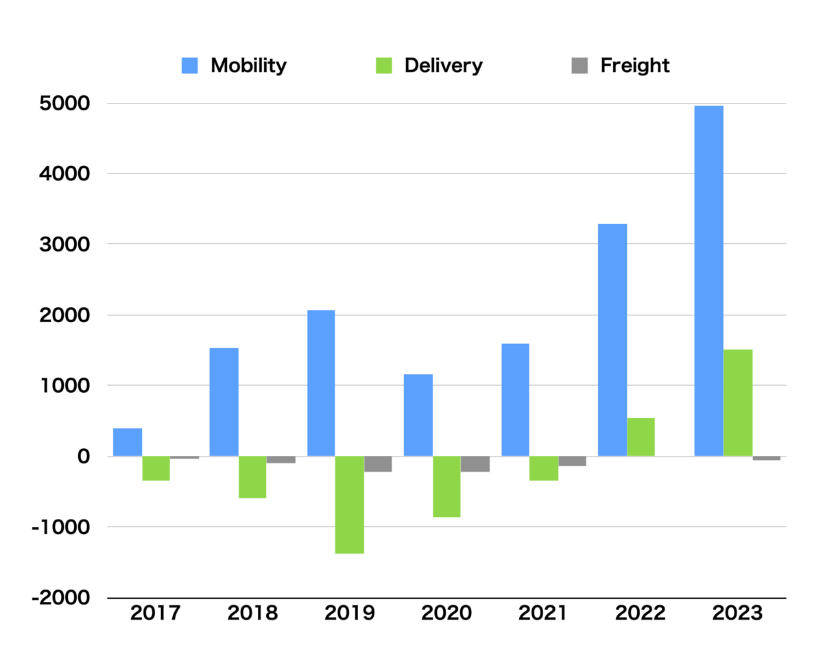 ウーバーの主要3事業についてEBITDAをグラフにしてみると、次のようになります。
