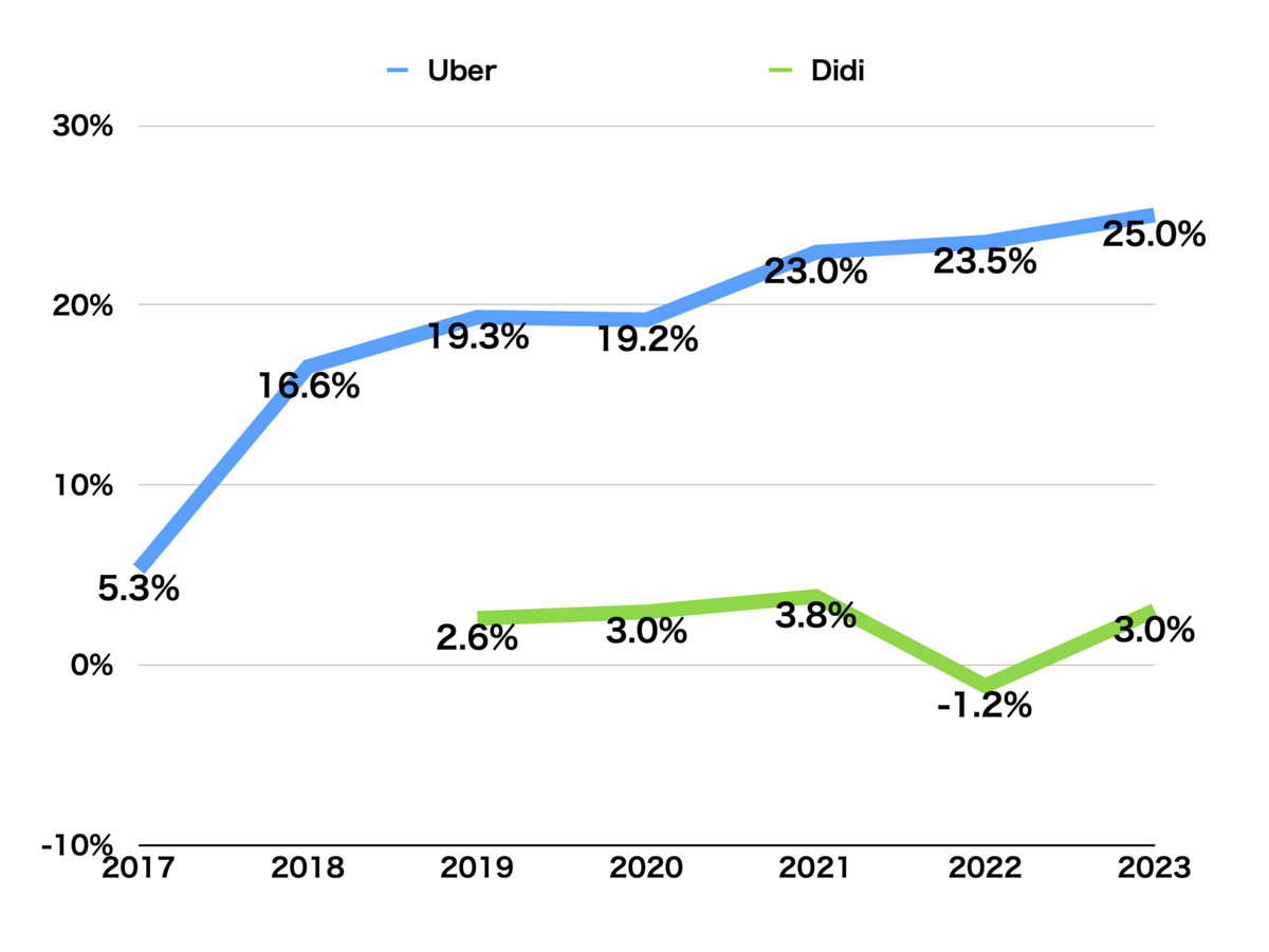 ▲ウーバーと滴滴のEBITDAマージンの推移。ウーバーは稼げる企業に成長できているが、滴滴は稼げる企業になっていない。
